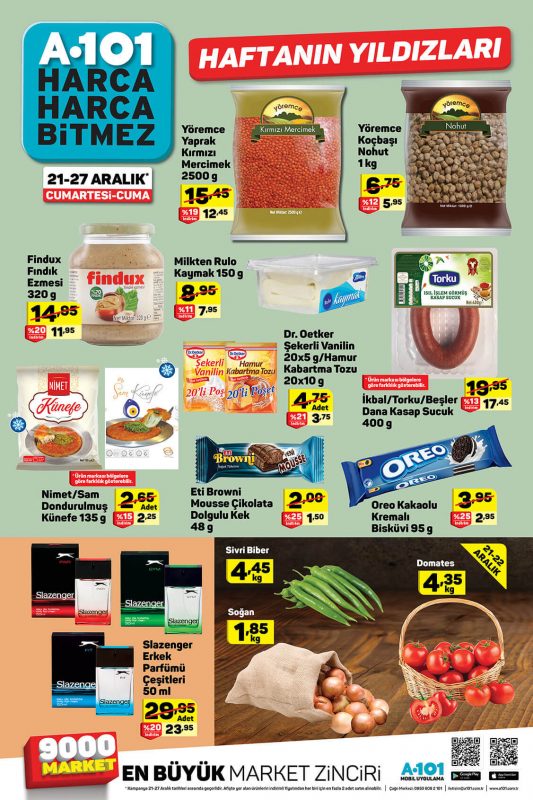 A101 21-27 Aralık Haftanın Yıldızları Cumartesi-Cuma kampanyası tam size göre. A101 Market kampanyalarındaki ürünler, İhtiyaçlarınıza en uygun çözümler için hazırlanmıştır. A101 fırsatları, aktüel kampanyalar, en iyi, en ucuz, en kaliteli ve en hesaplı ürünler. Kampanyaların site içi videoları burada. YouTube video kanalımız için tıklayınız.