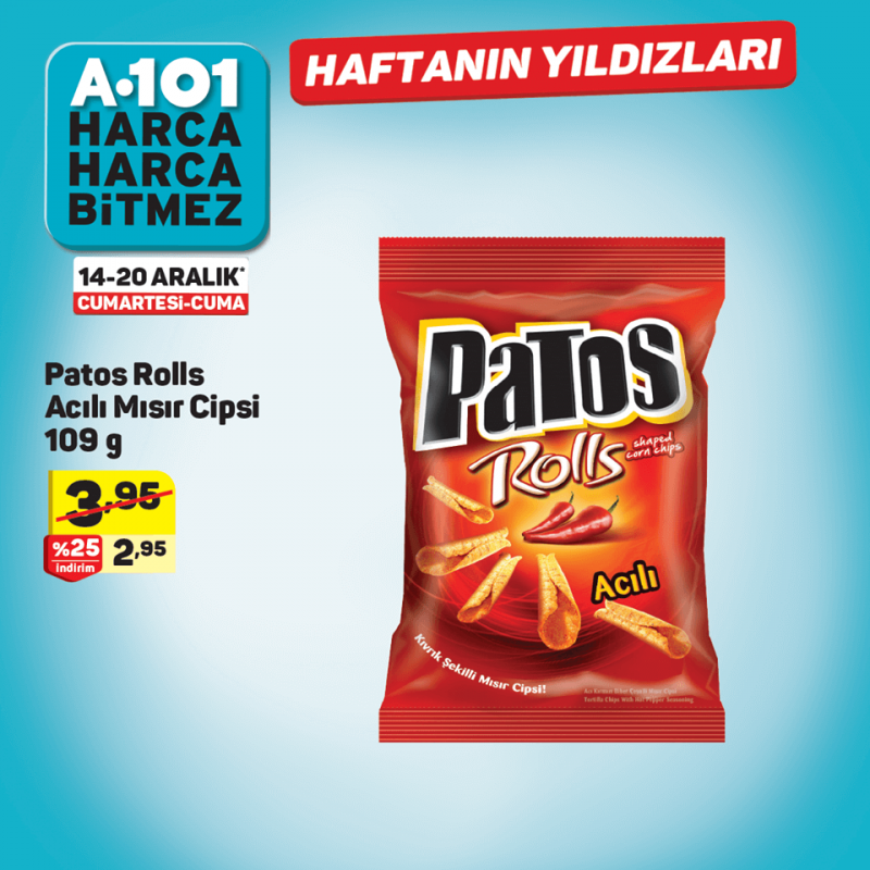 - Patos Rolls Acılı Mısır Cipsi 109 gr 2,95 ₺