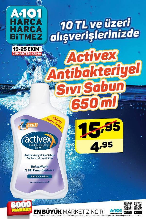 - Activex Antibakteriyel Sıvı Sabun 650 ml 4,95 ₺ (10 ₺ üstü alışverişlerde geçerli fiyat)