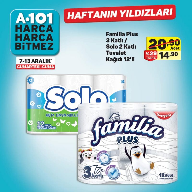 - Familia Plus 3 Katlı / Solo 2 Katlı Tuvalet Kağıdı 12’li 14,90 ₺