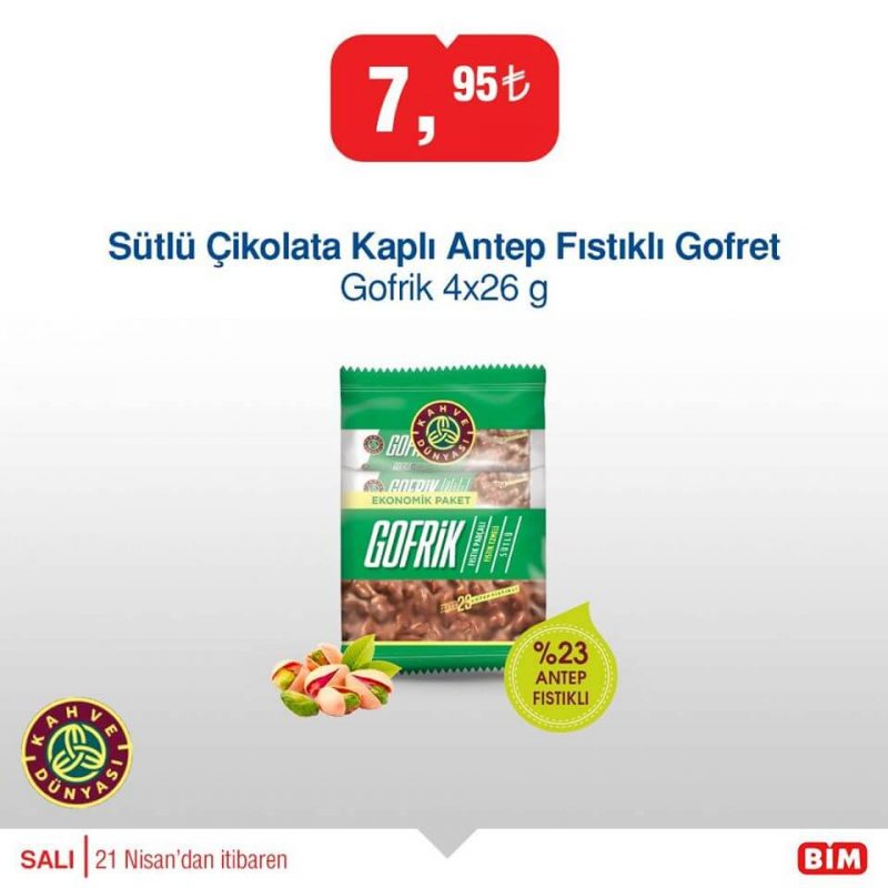 - Kahve Dünyası Bitter / Sütlü Çikolata Kaplı Antep Fıstıklı Gofret 4×26 gr 7,95 ₺